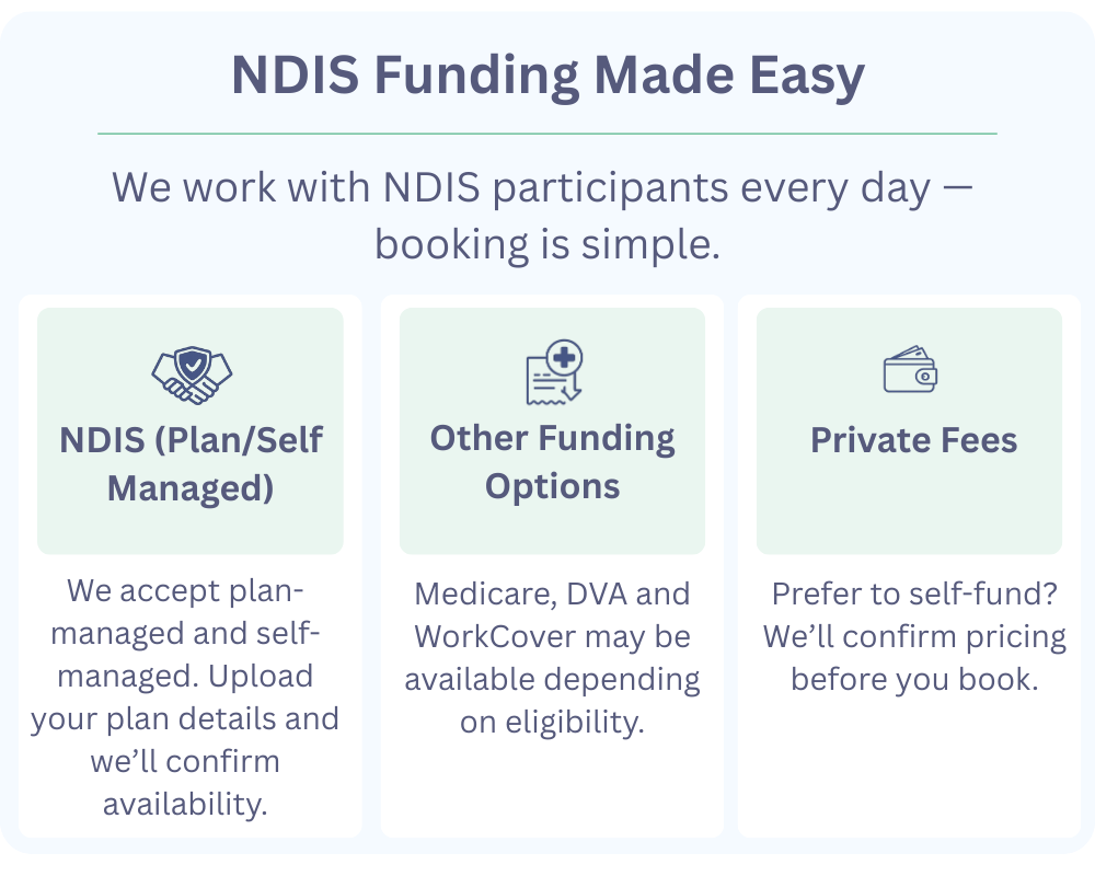 Yes. We support NDIS participants and can work with self-managed and plan-managed funding (and other arrangements depending on your situation). If you’re unsure what you are, we can help you confirm it.