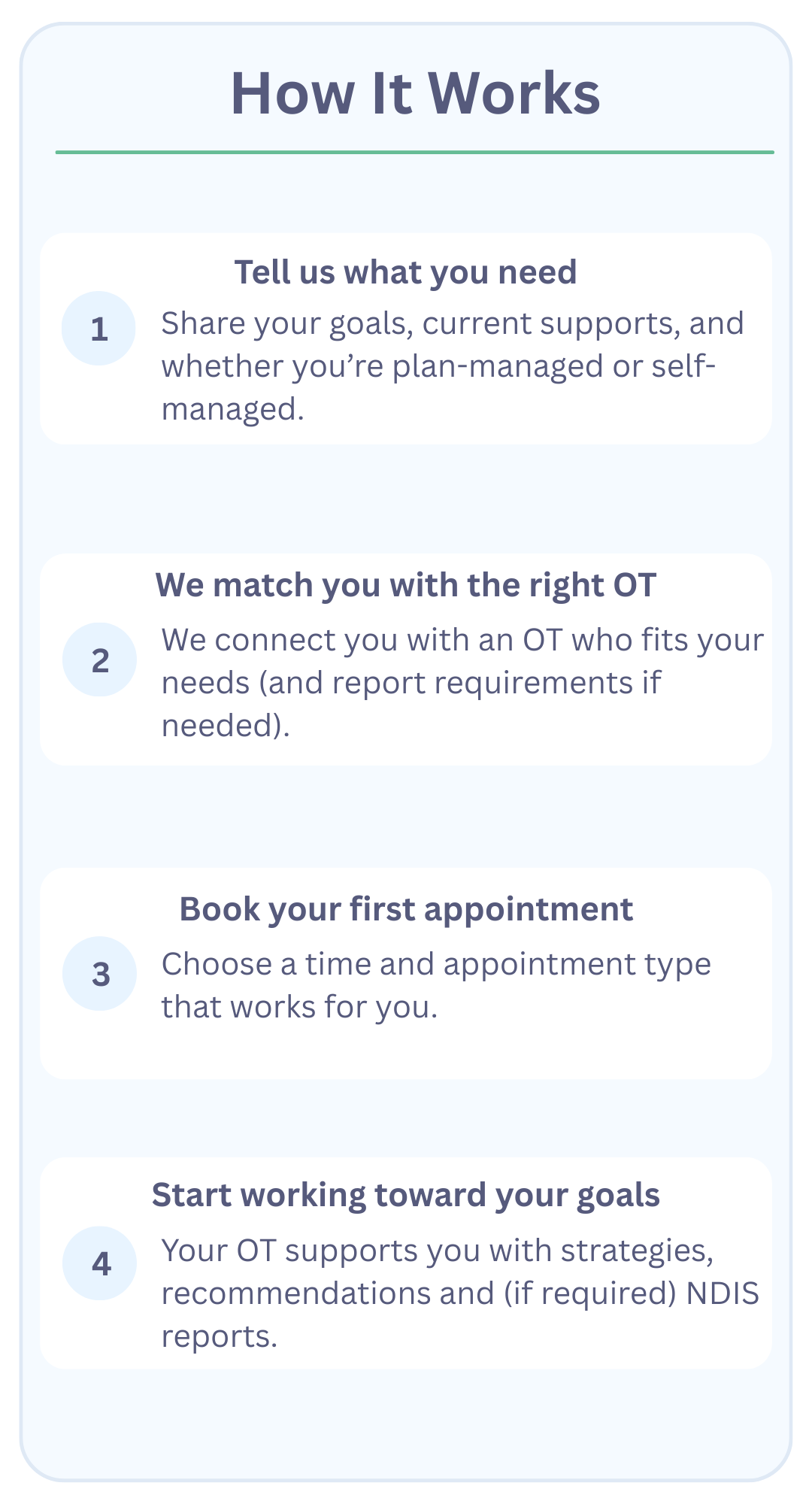 After you submit the form, we’ll review your details and contact you (usually within 1 business day). We’ll confirm your funding type (self/plan-managed etc.), what support you’re looking for, and help you book your first OT session.
